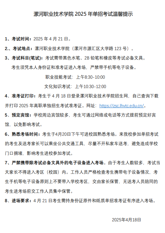 BEATS2025年单招考试温馨提示